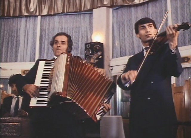 Тем временем мимо разорённых румынских колхозов несётся поезд, в котором словно селёдка в бочке вынуждены ютиться беспризорные мальчики-скрипачи, бабушки в platocheks и мужики в ushankas.