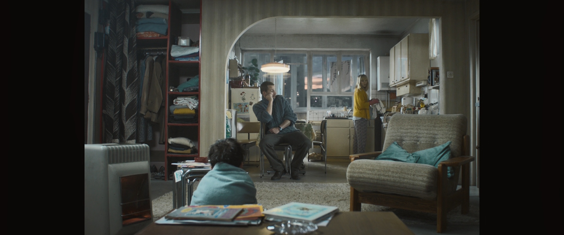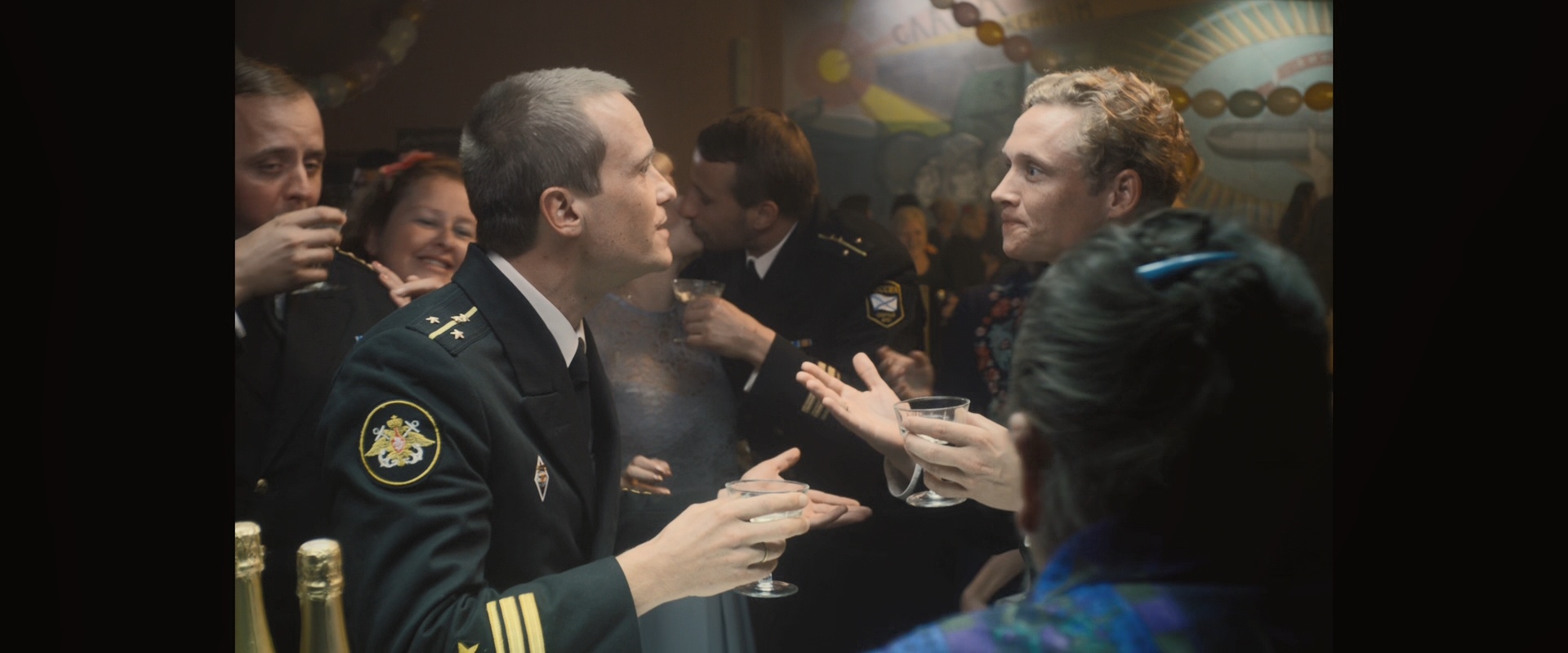 Члены семей подводников собираются на квартире у Антона, которая гораздо больше похожа на оную из типичного советского дома.