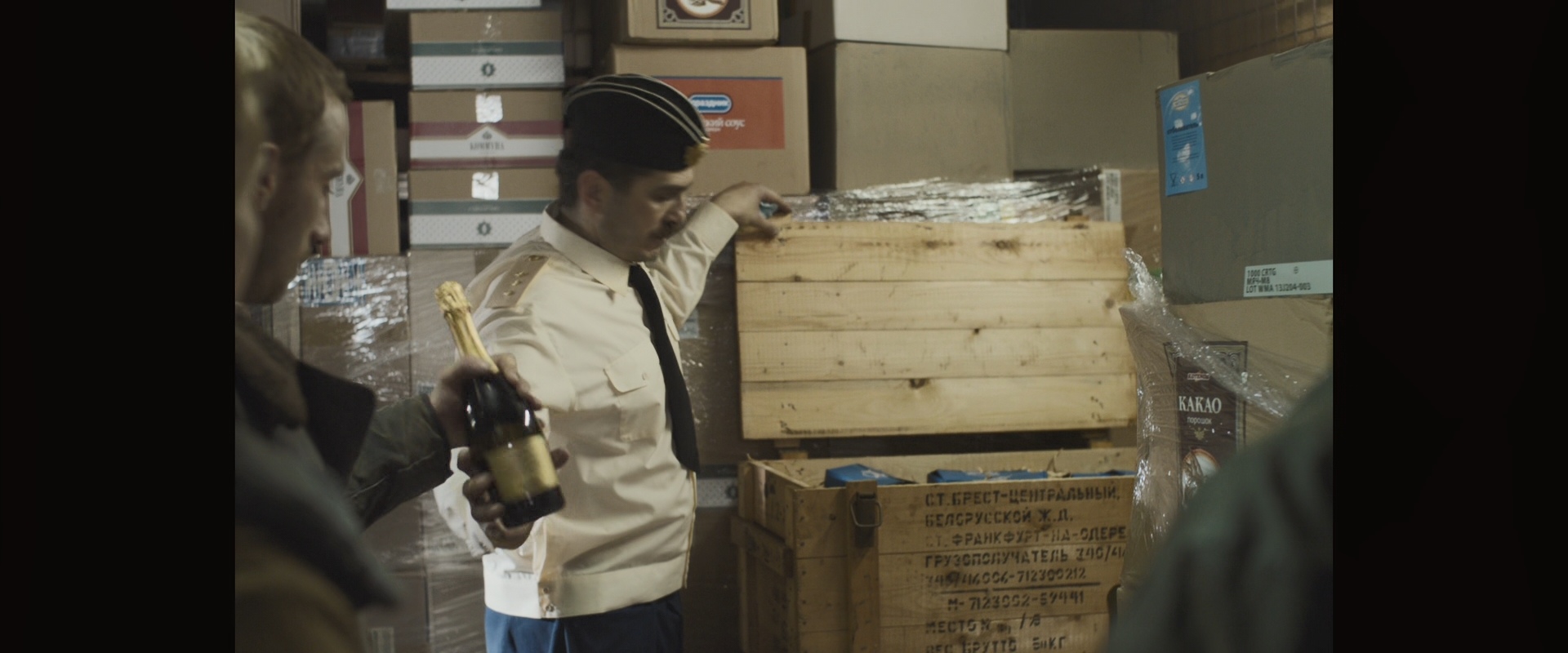 А тот делится казённым шампанским с продуктового склада. Надо отдать должное вниманию к деталям вроде надписей на ящике.