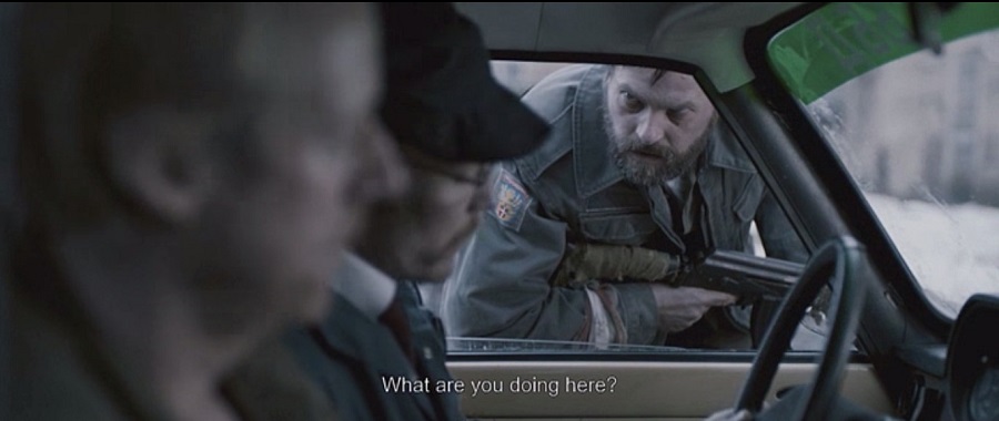 Однако британцы не выдают себя ни единым движением мускулов в своих штанах! С каменными лицами они едут на вартбурге на базу. Но тут кто-то орет в стороне и их останавливает типичный часовой с автоматом и в трениках. А кеды где? А кеды у нас зимой даже студенты не носят.